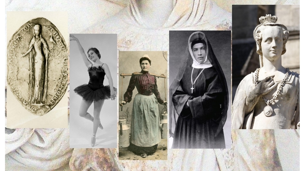– Introduction et chronologie du droit des femmes– Les Femmes et la politique (Isabelle Taillefer, Yolande de Bretagne, Béatrice de Bourgogne, Marguerite de Rohan, Louise de Savoie, Diane de France, Marie-Thérèse de France, Mathilde Mir)– Les Femmes et les arts (Clarisse Chatenet-Latapie, Lily Danière, Louise Foucaud, Lucie Valore, Maria Pajot, Marie-Matosès-Dumas, Marysa Lodi, Pastora Matosès, Suzy Bartolini)– Les Femmes au travail (ensemble d’images des femmes au travail dans les usines, marchés, écoles ..)– Les Femmes et les lettres (Julie d’Angennes, Marguerite de Valois, Marie Gounin, Mary Cressac, Odette Commandon, Rosa Tiffon de Saint-Surin, Yvette Renaud, Zulma Carraud, Denise Bélanger)– Les Femmes, la religion et les œuvres sociales (Hélie Guillebauld, Marguerite Leclerc-Chauvin, Louise Lériget, Lucie Landré, Madeleine d’Orléans, Marie Duny, Soeur Saint-Cybard)– Les Femmes et leur représentation (dans la ville : sculptures, murs peints…)